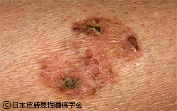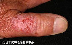 ボーエン病は、有棘細胞癌と同様に表皮の有棘層の細胞が癌化しますが、その増殖は表皮の中だけに留まり(表皮内癌と呼ばれています)、真皮に及んでいない状態です。この状態であれば通常転移することはありません。